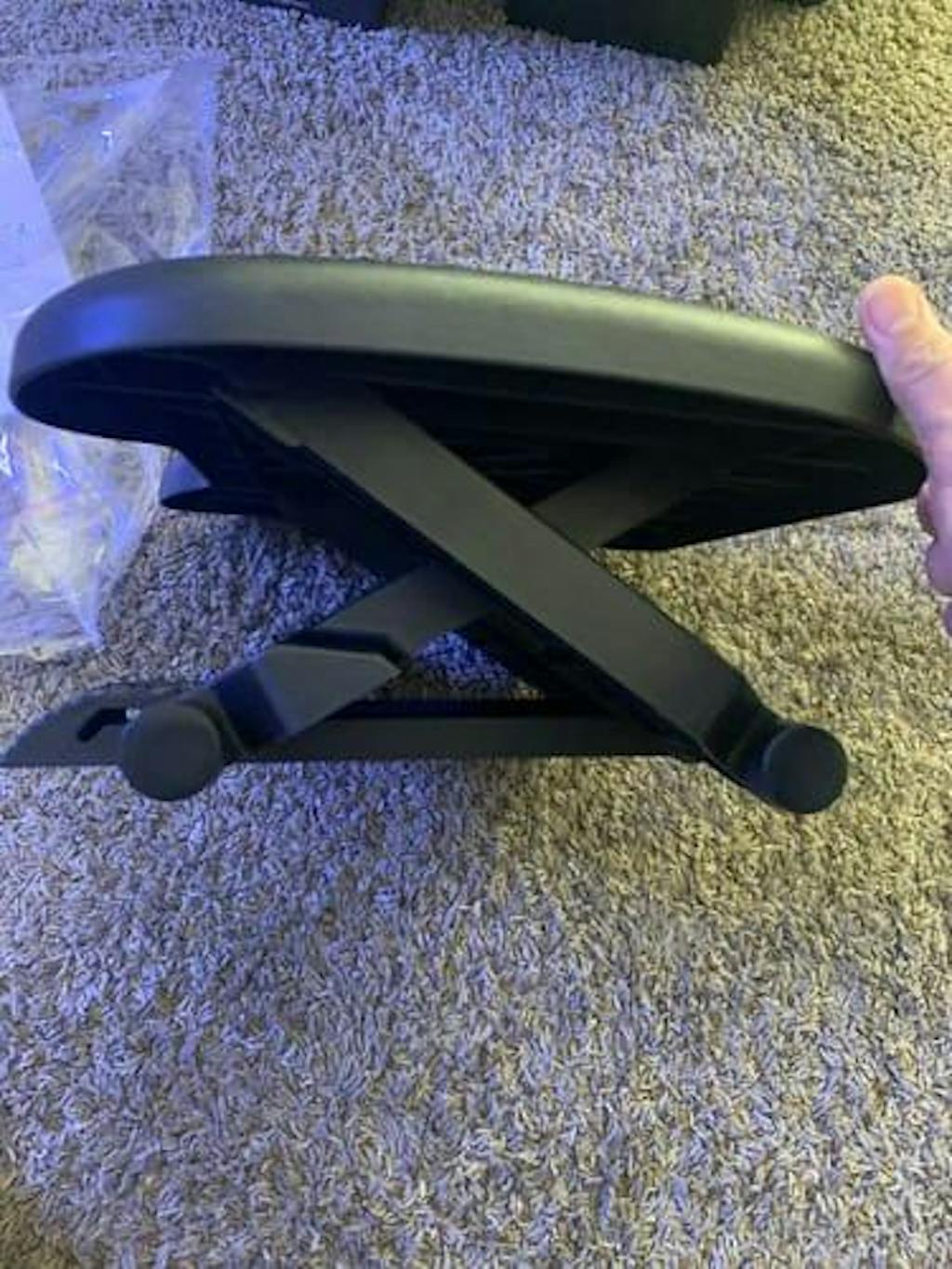 Was using a small stool to support feet until this came along. Its designed well to support feet when sitting on a desk thats high/ un-adjustable. We love it so far.