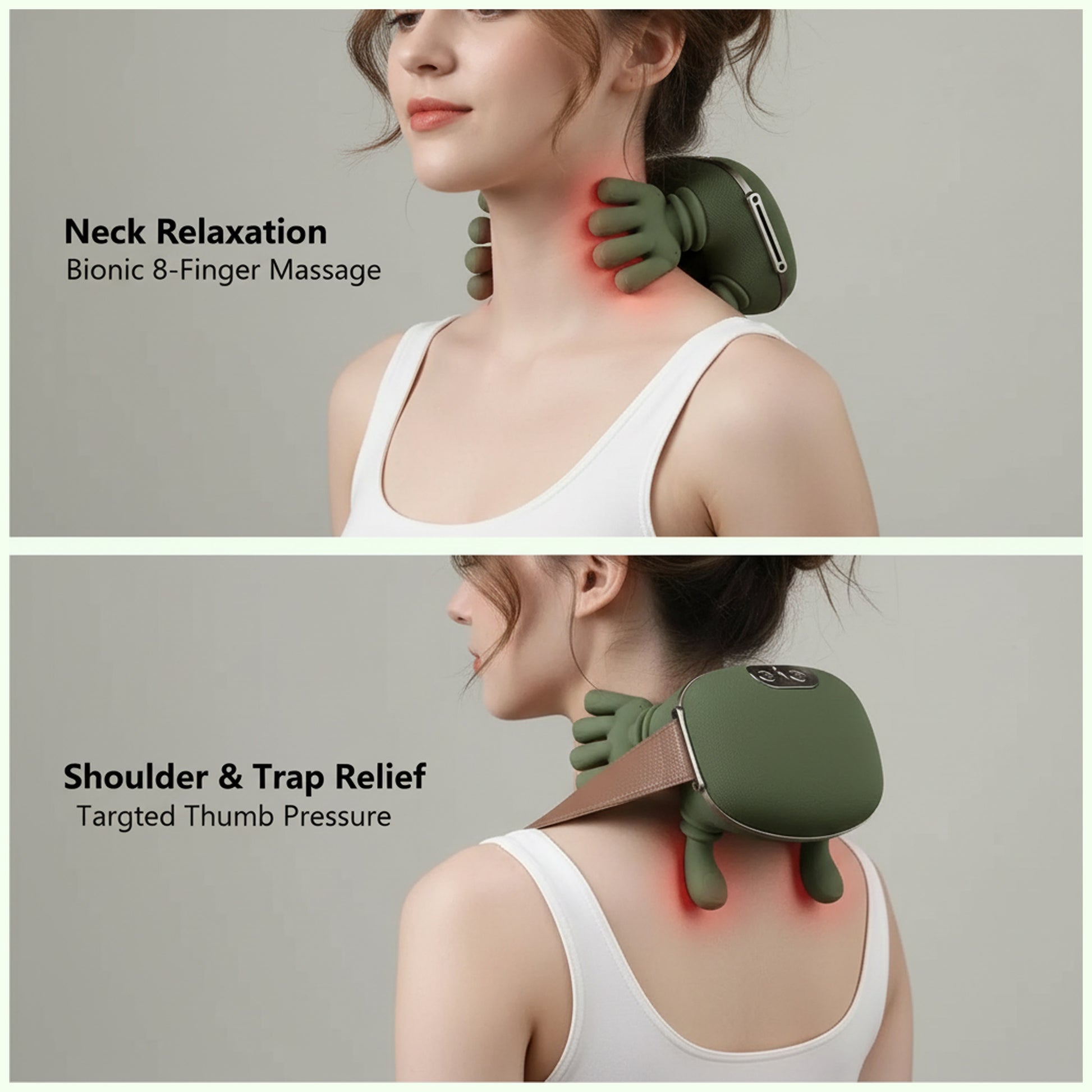 This massager uses 4D kneading technology to mimic natural hand movements. The upper massage nodes gently wrap around the neck area, while the lower nodes apply rhythmic kneading motions across the shoulders.